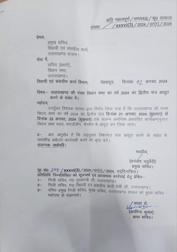 देहरादून: मानसून सत्र पर धुंधली तस्वीर से बादल छंट गए हैं। ग्रीष्मकालीन सत्र को लेकर सरकार ने समय व स्थान तय कर लिया है। इसके लिए पिछले दिनों कैबिनेट ने मुख्यमंत्री धामी को अधिकृत किया था। यह ग्रीष्मकालीन सत्र 21 अगस्त से 23 अगस्त तक भराड़ीसैंण में आयोजित होगा। जिसका आदेश भी जारी हो चुका है।