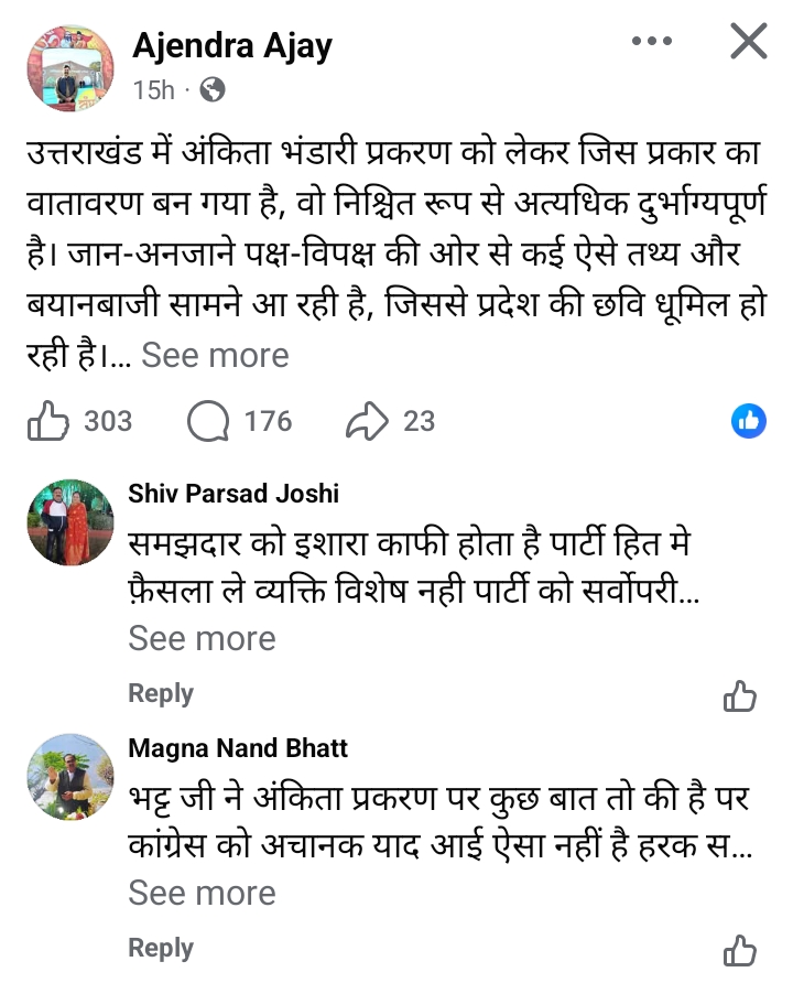 बीजेपी नेता और बद्री-केदार मंदिर समिति के पूर्व अध्यक्ष अजेंद्र अजय की सोशल मीडिया पोस्ट ने राजनीतिक गलियारों में हलचल मचा दी है। उन्होंने अंकिता भंडारी प्रकरण को गंभीर बताते हुए मामले की CBI जांच की खुली मांग की है।