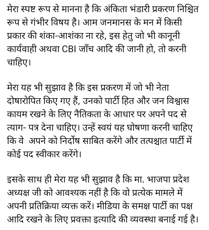 उन्होंने आगे कहा कि अंकिता भंडारी मामले में आरोपों का सामना कर रहे नेताओं को पार्टी हित और नैतिकता के आधार पर अपने पद से इस्तीफा दे देना चाहिए। साथ ही यह भी कहा कि वे स्वयं आगे आकर यह घोषणा करें कि वे खुद को निर्दोष साबित करेंगे और उसके बाद ही पार्टी का पद स्वीकार करेंगे।
