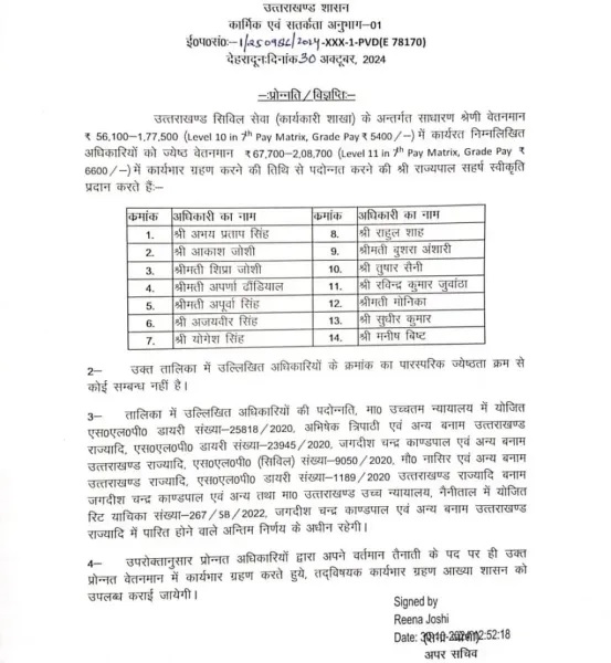 प्रमोशन पाने वाले अधिकारियों में अभय प्रताप सिंह, आकाश जोशी, शिप्रा जोशी, अपर्णा ढौंडियाल, अपूर्वा सिंह, अजयवीर सिंह, योगेश सिंह, राहुल शाह, बुशरा अंसारी, तुषार सैनी, रविन्द्र सिंह जुवांठा, मोनिका, सुधीर कुमार और मनीष बिष्ट शामिल हैं।