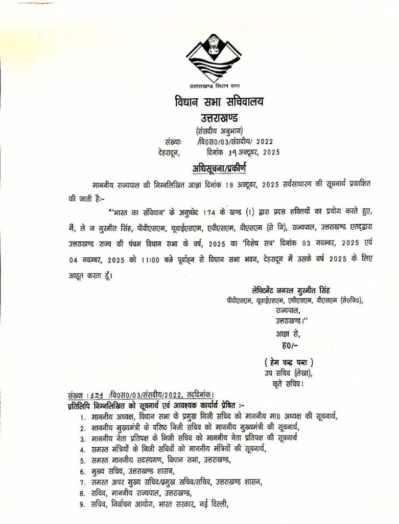 देहरादून: उत्तराखंड राज्यपाल ने विधानसभा के दो दिवसीय Special Session को मंजूरी दे दी है। यह विशेष सत्र 3 और 4 नवम्बर को देहरादून में आयोजित किया जाएगा। सत्र का आयोजन सुबह 11:00 बजे से किया जाएगा।