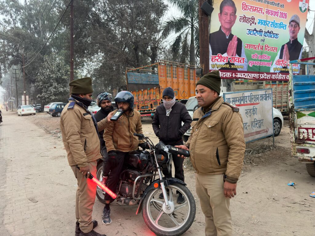 हरिद्वार/रुड़की: नववर्ष के जश्न के बीच सड़क हादसों पर रोक लगाने के लिए प्रशासन पूरी तरह सतर्क नजर आया। रुड़की में ड्रिंक एंड ड्राइव के खिलाफ विशेष चेकिंग अभियान चलाया गया, जिसमें नशे में वाहन चलाने वालों पर कड़ी कार्रवाई की गई।