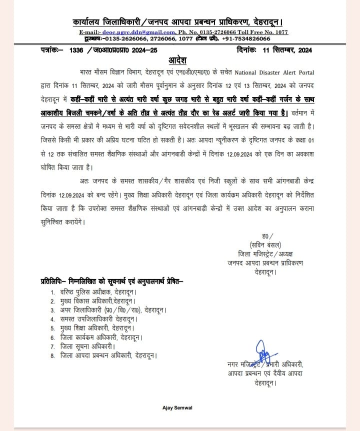 मौसम विज्ञान विभाग की ओर से जारी पूर्वानुमान के अनुसार 12 एवं 13 सितंबर को जनपद देहरादून में भारी वर्षा का रेड अलर्ट जारी किया गया है। जनपद के कई क्षेत्रों में भारी वर्षा के दौरान संवेदनशील स्थानों पर भूस्खलन की संभावना बढ़ जाती है। किसी अप्रिय घटना को रोकने के लिए जिले में कक्षा 01 से 12 तक संचालित सभी शैक्षणिक संस्थान, आंगनबाडी केंद्रों में बृहस्पतिवार को एक दिन का अवकाश घोषित किया गया है। चमोली, चंपावत और बागेश्वर में भी कक्षा 01 से 12 तक स्कूल और आंगनबाड़ी केंद्र बंद रहेंगे।